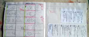 ■ノートではなく、ルーズリーフか独立したA4の紙を使う。ノートでは、順番を変えることができません。また、付け足すこともできません(破ることはできますね)。私はA4の紙に一枚一枚描いています。 (写真参照→) ■絵コンテは、シーンごとにページを変える。 例え1カットしかないシーンでも、1ページには1シーンだけです。短いシーンは、別の場所に編集時に移されることも多いからです。 ■絵コンテは鉛筆で描く。 もちろん、絵に自信のある人はペンで描いて下さい。その方がしっかりとした絵になり、コピーしてもきれいです。また、余力があるのならペン入れなんかもしてもいいのですが、そんな時間があれば早く描き終われ!ってことになると思います。 最初はやはり鉛筆でガシガシ描いて、間違えたら消して、どんどん先に進みましょう。 ■コマの横の余白にはセリフとアイディアを書き込む。 すぐ右側の余白には、そのコマで話されるセリフを書き込みましょう。ただ、全部書いていたららちがあかないので、“A「○○だね」〜B「違うんだよ」まで”程度で構いません。 また、“ここはヒッチコックの『鳥』のようなアングルで”など、絵コンテを描きながら思い付いたこともメモしていきましょう。 セリフやメモはしかし、タイプうちをしたいなと思いませんか?役者さんがしっかり読めるように。 でも、これは私の経験ですが、役者さんの多くは絵コンテをあまり見ません。参考程度にながめるだけのことが多いです。彼らにとって、脚本がすべて、なんですよね。なのでセリフも読んで分かる程度で構わない、と考えて良いでしょう。 監督が分かれば、それでよいのです。問題は、「自分が読んでも分からないことがある」ってことです(笑)。いろんな方法を試した結果、私は写真のようなやり方に落ち着きました(写真1参照→)。 大きめのノートを買ってきて、左側に絵コンテを、右側にはその絵コンテに相当する部分の脚本を、それぞれ貼付けています。
