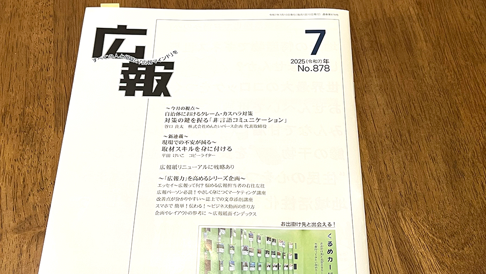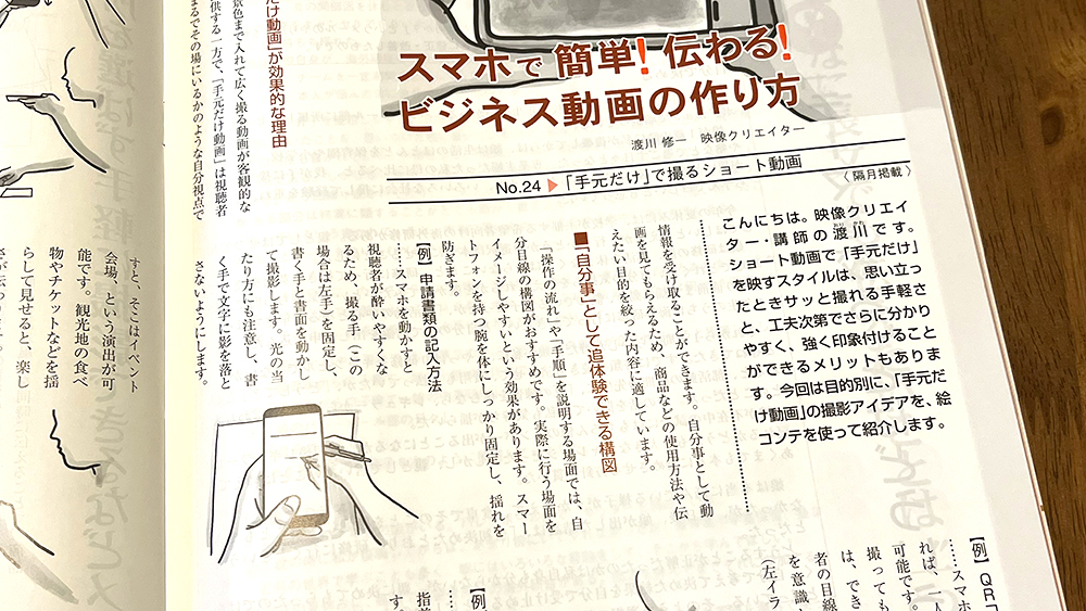 【連載24回目】手元だけで撮るショート動画(月刊広報) お仕事情報 2025.07.24 月刊広報(公益社団法人 日本広報協会発行)7月号の連載が公開されました。 『「手元だけ」で撮るショート動画』 1人で手元を撮りながらどんな動画が作れるか。 撮り方の絵コンテとともにまとめました。 関連